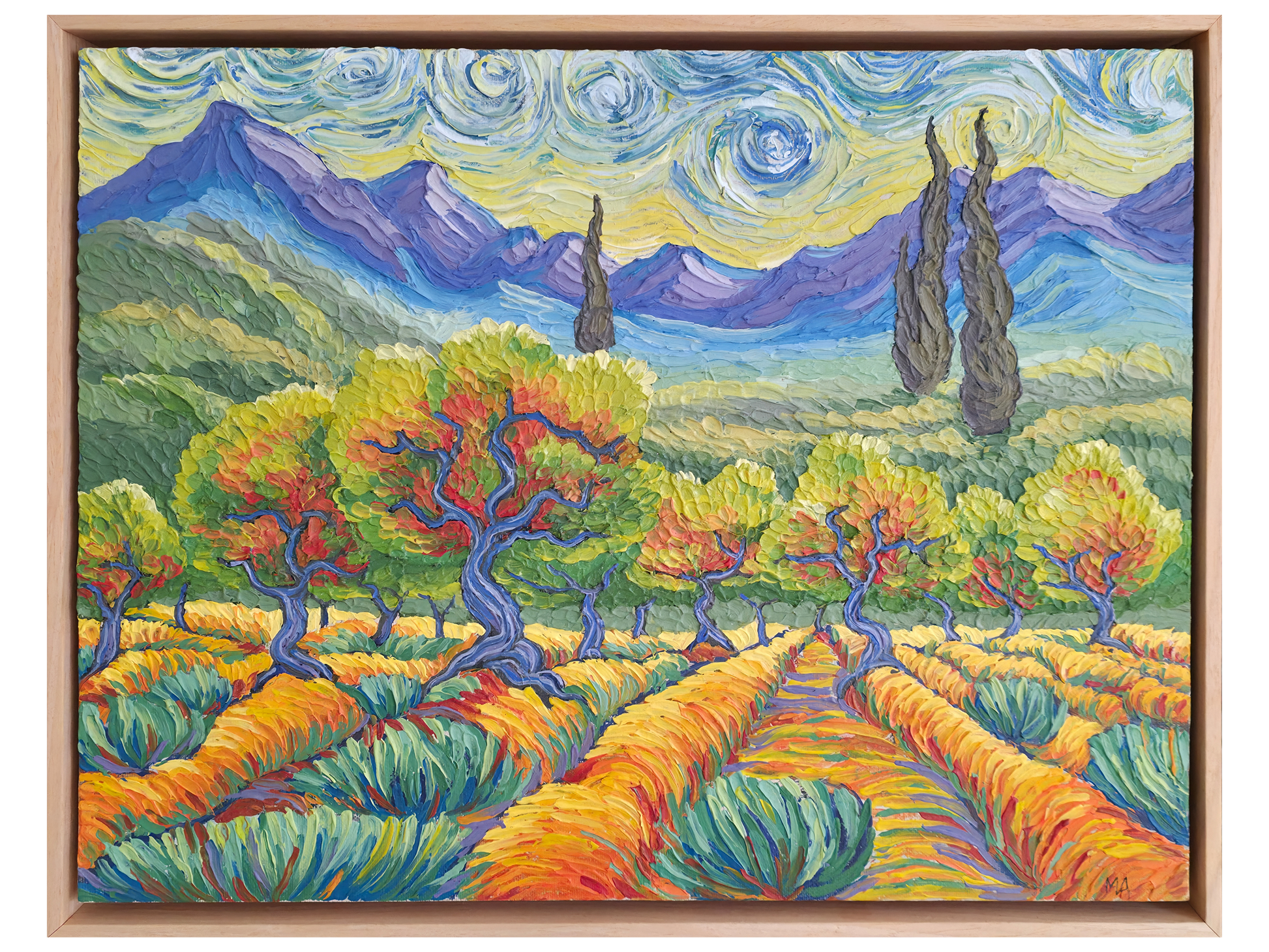 This exceptional piece with the most amazing three dimensional layering really makes this work POP out of the frame. Paying homage to Van Gogh's 'Starry Night', Marc has really outdone himself on this one!