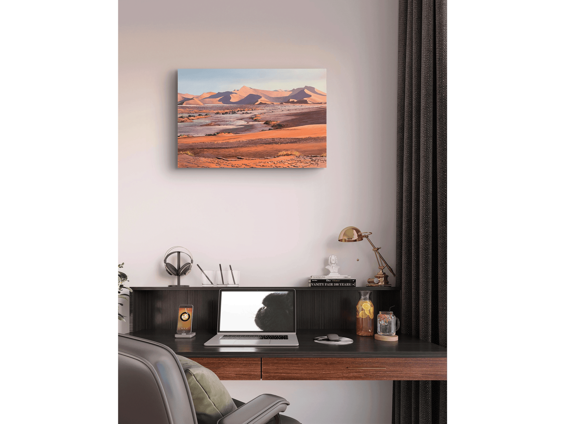 Yates demonstrates masterful control of light and shadow, defining the colossal scale of the famous red sand dunes in the background. These enormous, iron-oxide-rich dunes, emblematic of the Namib Desert, are depicted during the golden hour, where the light creates sharp, dynamic lines and colour contrasts. The sun illuminates the dune ridges with a fiery orange and deep terracotta, while the valleys fall into long shadows of violet and mauve, creating a stunning abstract geometry across the background.