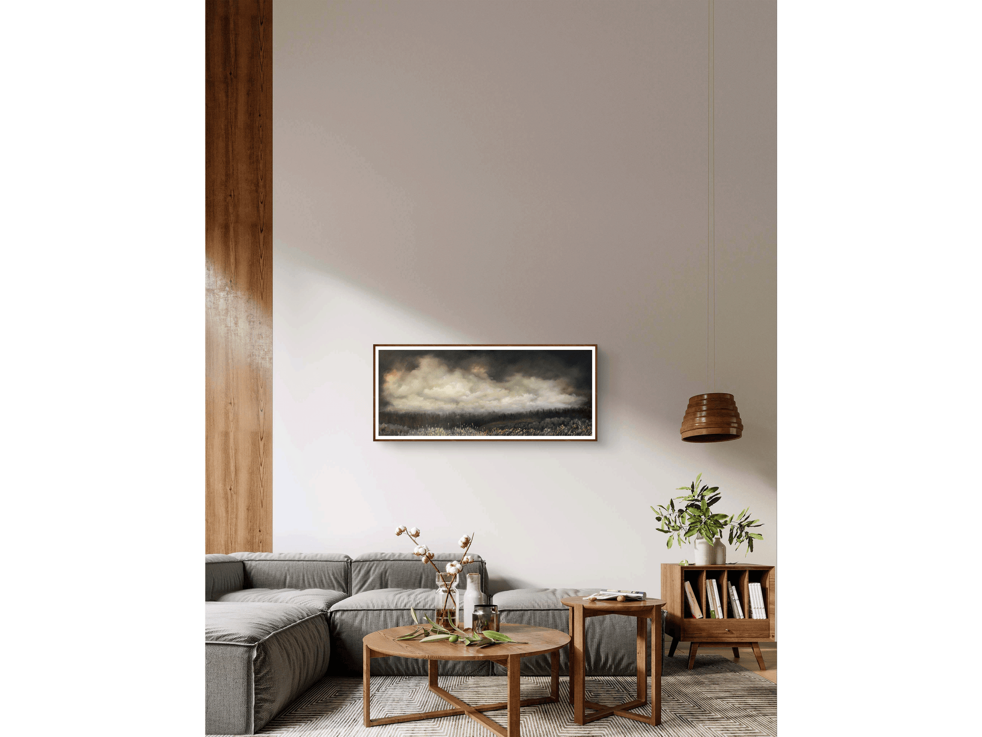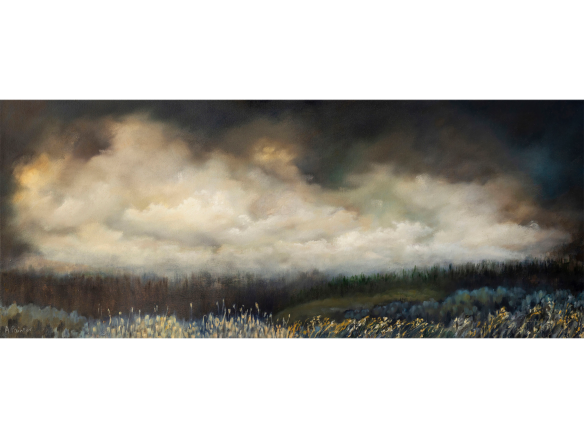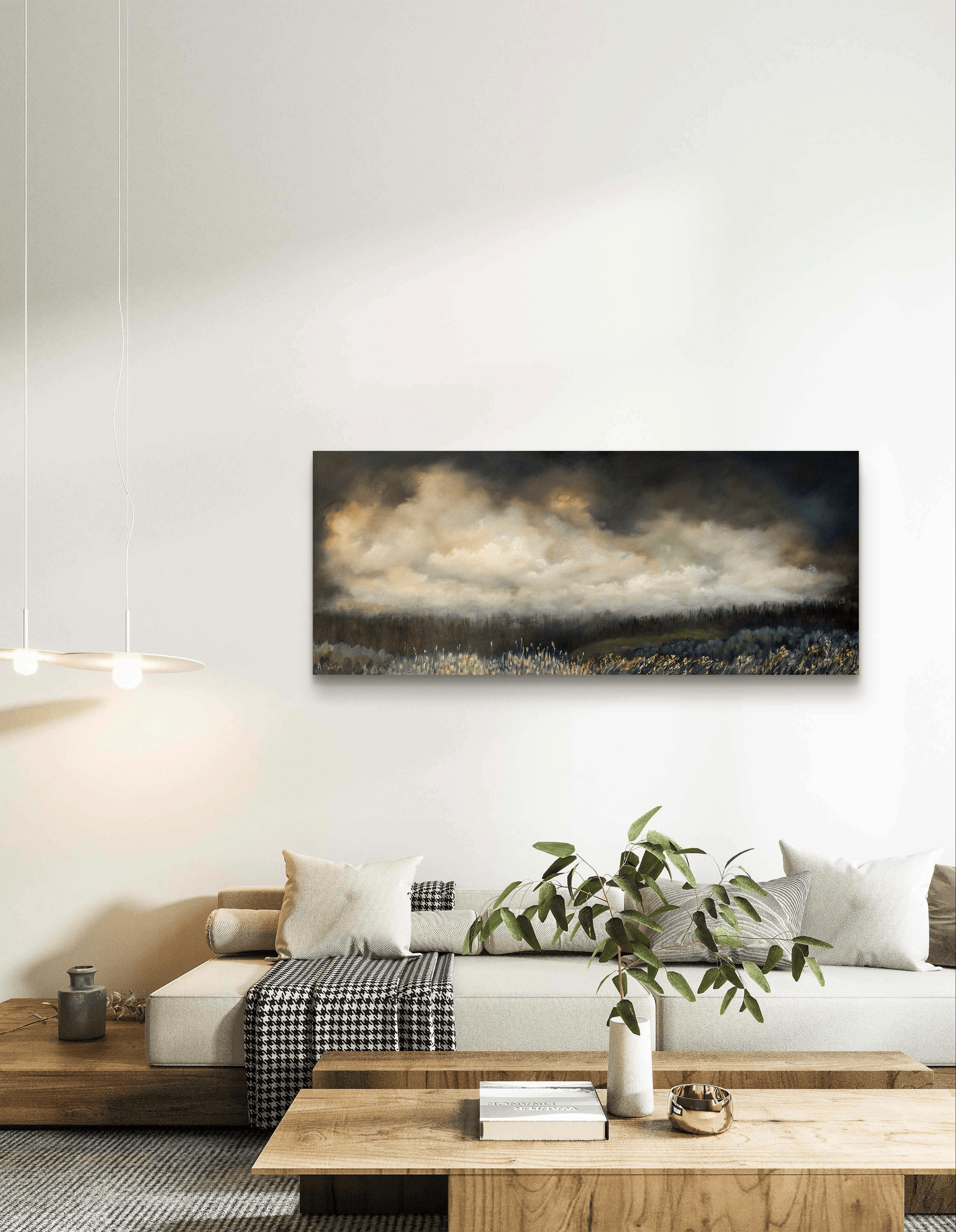 "Approaching the Pines" is a compelling contemporary landscape that masterfully captures the dramatic tension and ephemeral beauty of a changing sky. This panoramic oil painting is a powerful study in atmospheric contrast, expertly balancing light and shadow, and movement and stillness. The immense, turbulent sky is the dominant feature, executed with a skillful hand that gives the clouds a truly palpable texture and volume. A luminous, creamy gold and soft white light bursts from the centre, suggesting a sudden break in a storm or the profound quiet just before one begins. This brilliant light is framed by deep, brooding tones of charcoal, slate, and midnight blue, which imbue the upper register with a sense of depth and gravitas. The horizon is anchored by a dense, dark expanse of forest—the titular pines—rendered in cool greens and blues that provide a grounding counterpoint to the dynamic sky. In the foreground, the artist employs loose, expressive brushwork to depict tall, dry grasses in muted yellows and ochres, creating a textural layer that feels windswept and alive. This piece excels in evoking a mood of powerful introspection, speaking to the raw, untamed force of nature and the profound stillness one can find within it. "Approaching the Pines" is an ideal acquisition for a collector seeking a sophisticated, large-scale work that commands attention and offers a continuously engaging visual experience, serving as a powerful testament to the artist's ability to transform a fleeting moment in nature into a permanent, emotive statement.