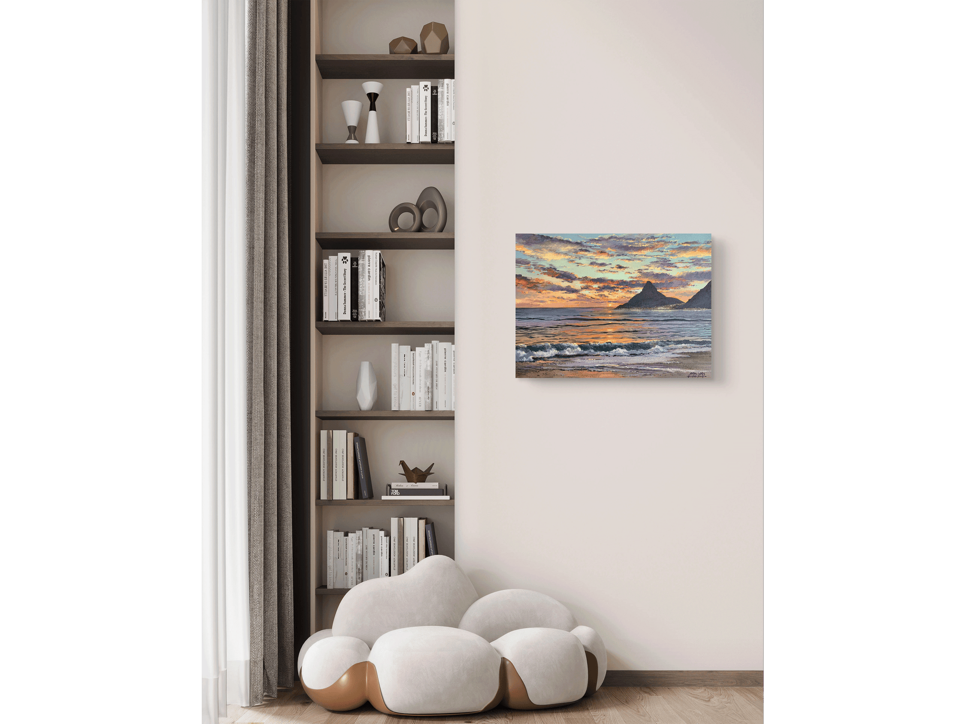 'Atlantic Sunset' is a vibrant and atmospheric original oil on canvas by the renowned South African artist, James Yates (b. 1944). This captivating coastal seascape, measuring 45 cm (Height) x 61 cm (Width), is a superb example of Postwar & Contemporary painting, capturing the exhilarating sunset over the Cape Peninsula coastline. As a masterful piece of South African fine art, it is a highly collectable work from an artist renowned for his ability to translate the transient effects of light into lasting oil paintings.