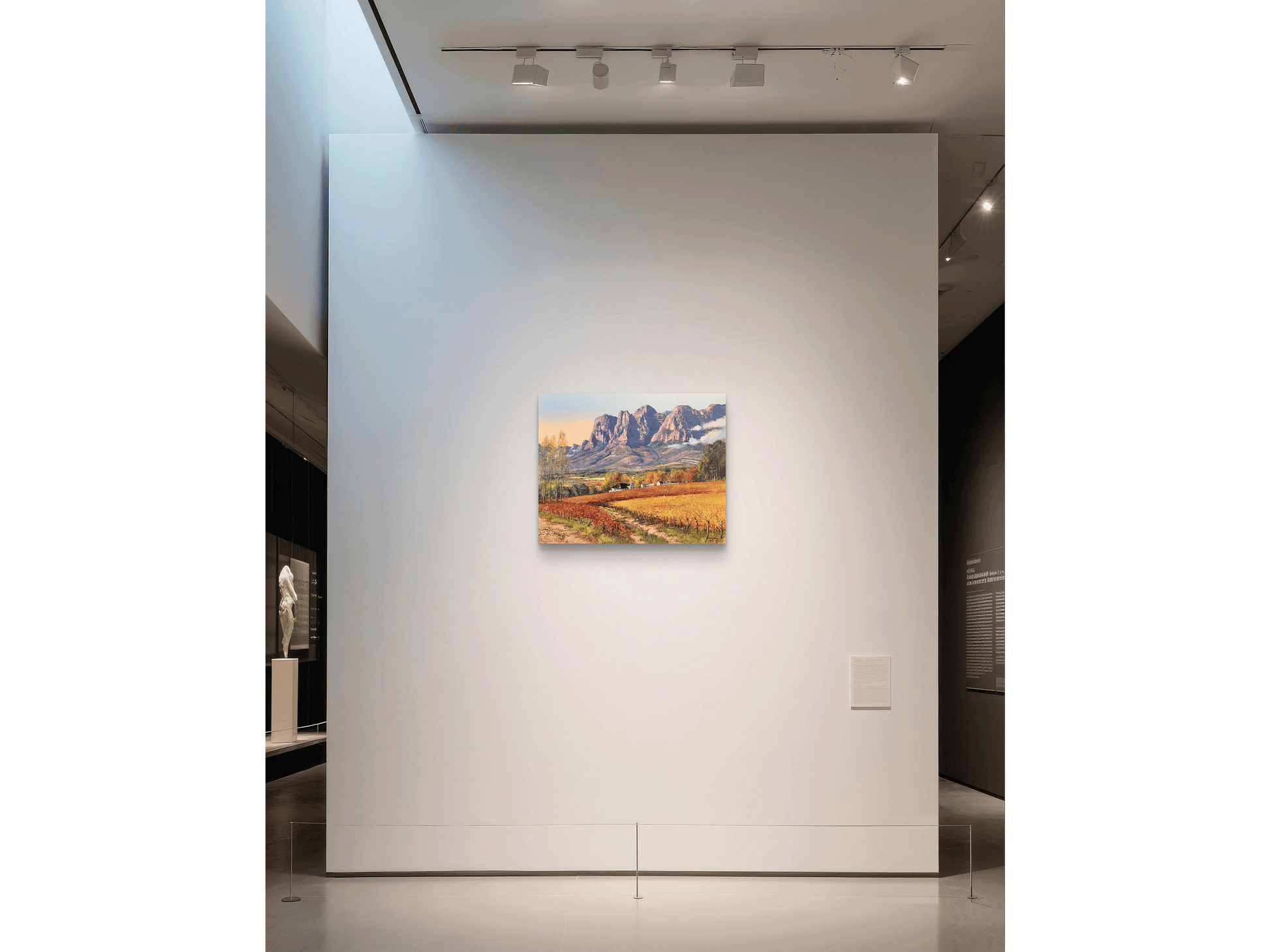 The composition masterfully employs contrasting colours and textures. The foreground is dominated by the vast, luminous vineyards, where the vine leaves transition into brilliant shades of cadmium yellow, deep amber, and fiery red, creating a textured, painterly path into the distance. A strip of dark green foliage acts as a recessive plane, emphasising the Cape Dutch homestead nestled centrally, its white walls glowing under the warm, low light of the sun. This detail firmly roots the painting in South African fine art history.