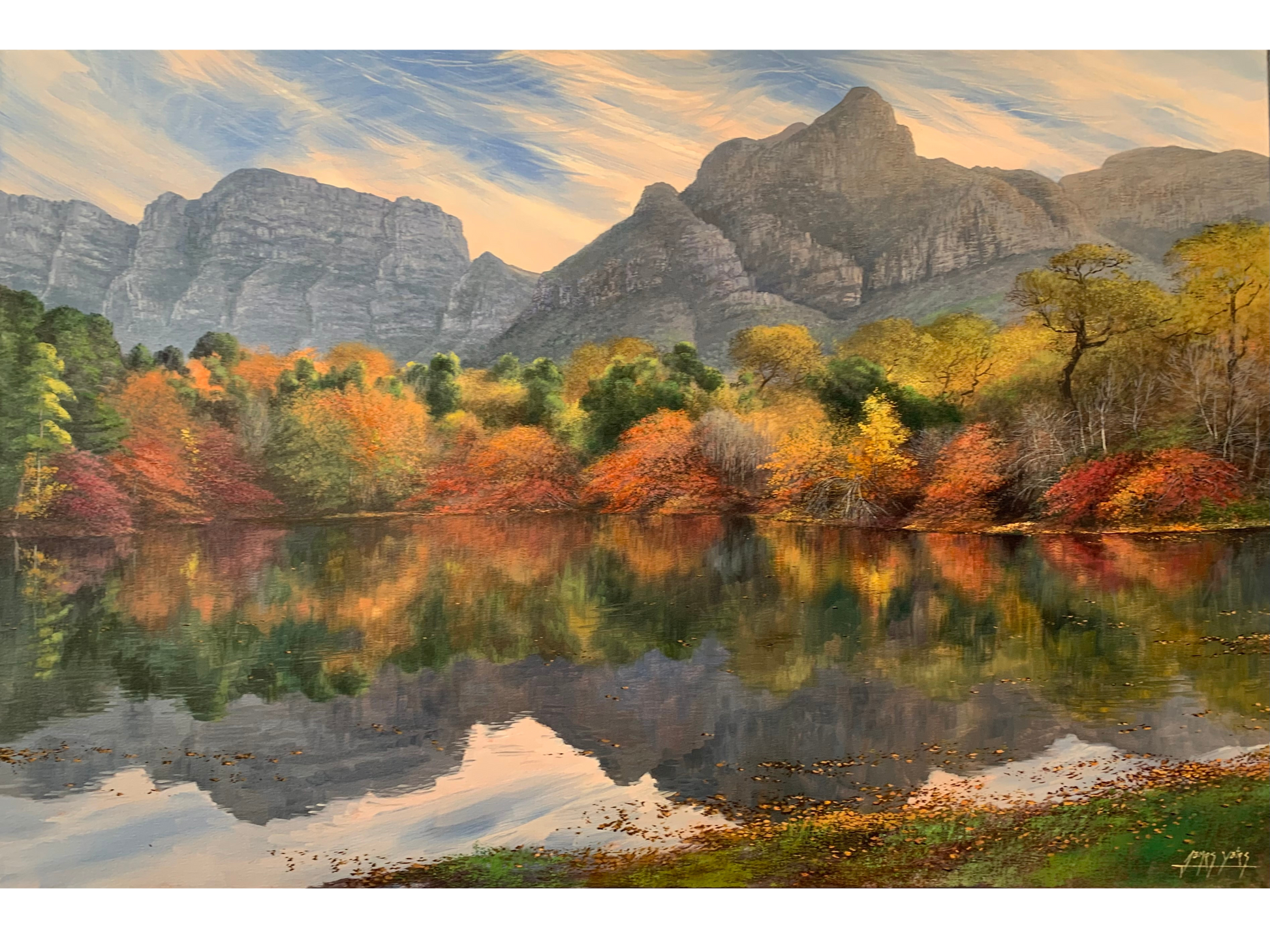 Autumn reflections in the Newlands Forest' is a magnificent original oil on canvas by the South African master, James Yates (b. 1944). This grand-scale piece, measuring 80 cm (Height) x 120 cm (Width), is a breathtaking celebration of the seasonal transformation on the slopes of Table Mountain near Cape Town. As a prime example of Postwar South African Realism, the work captures an idyllic scene of the forest edge and a still body of water, making it a highly desirable acquisition for collectors of iconic Cape landscapes and African fine art.