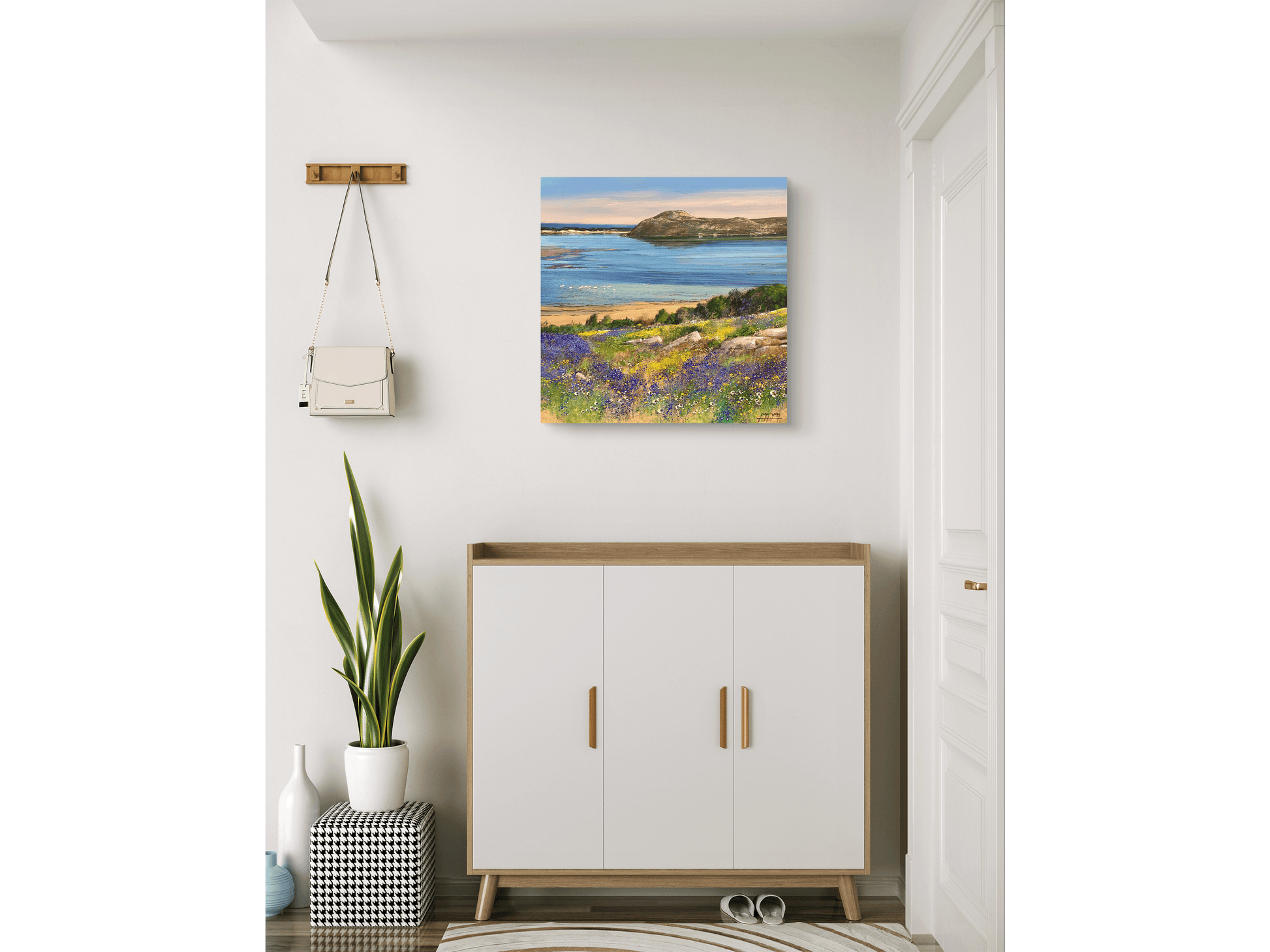 'Blue Lagoon, Langebaan' is a vibrant, square-format original oil on canvas by South African master James Yates (b. 1944). Measuring 70 cm (Height) x 70 cm (Width), this piece perfectly captures the breathtaking spring scenery of the West Coast of South Africa, combining the tranquil beauty of the Langebaan Lagoon with the spectacular colours of the blooming fynbos and wildflowers. This painting is a luminous and highly collectable South African landscape and a superb example of Postwar Realism.