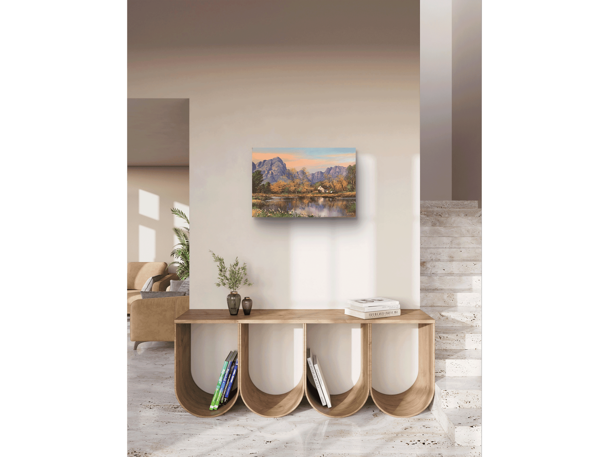Discover the tranquil heart of the Cape Winelands with this radiant original oil painting, titled 'Farm Dam on Zeverivieren farm, Banhoek' by the celebrated South African artist James Yates. This exquisite piece captures a peaceful autumn moment near Stellenbosch.