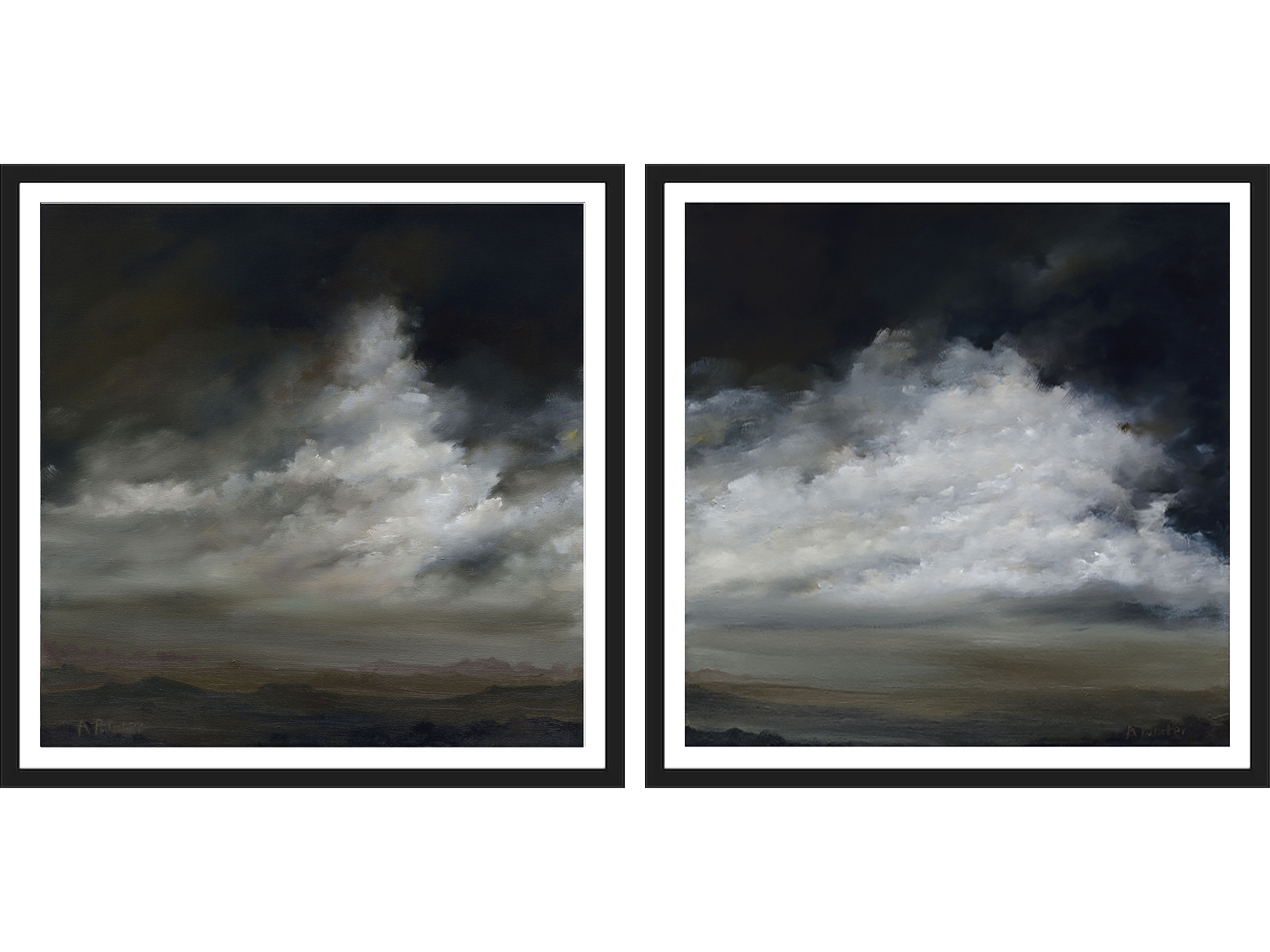 Taken together, the diptych is a meditation on the beauty and tension inherent in transitional moments—the calm before the storm, the interplay of light and shadow, and the infinite dialogue between the earth and the heavens. It is a work that speaks to the Romantic tradition of landscape painting while maintaining a contemporary, focused execution. The juxtaposition of the two distinct, yet harmonious compositions invites the viewer to consider both pieces not just as separate vistas, but as a continuous unfolding of a powerful atmospheric event.