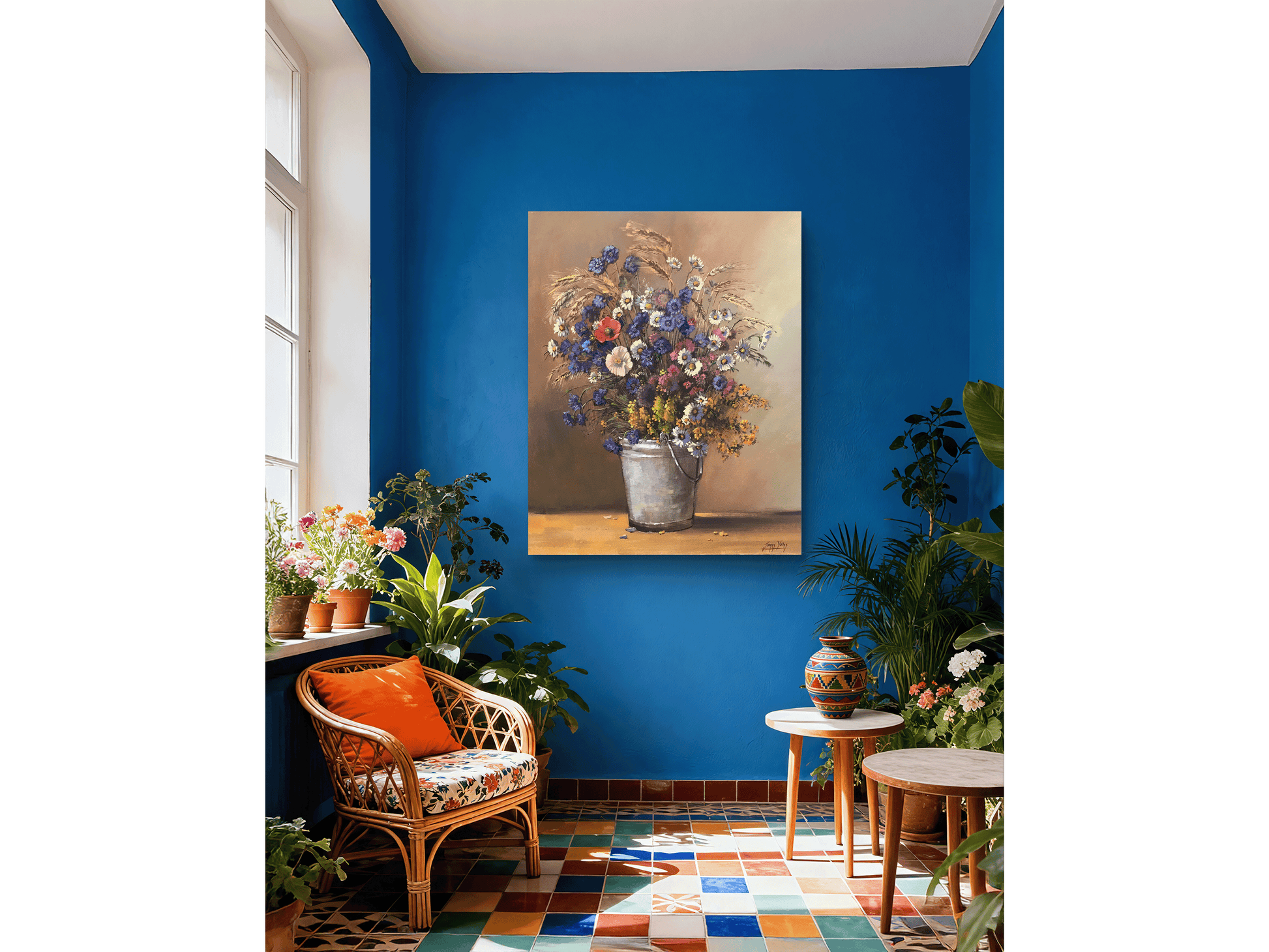The artist has created a stunningly rich bouquet, overflowing with gorgeous wildflowers: brilliant blue cornflowers, cheerful white daisies, deep purples, and lovely splashes of pink and yellow. The sheaves of golden wheat add a wonderful texture and a feeling of harvest and plenty. The silvery metal bucket provides a charming rustic contrast to the explosion of colour above.
