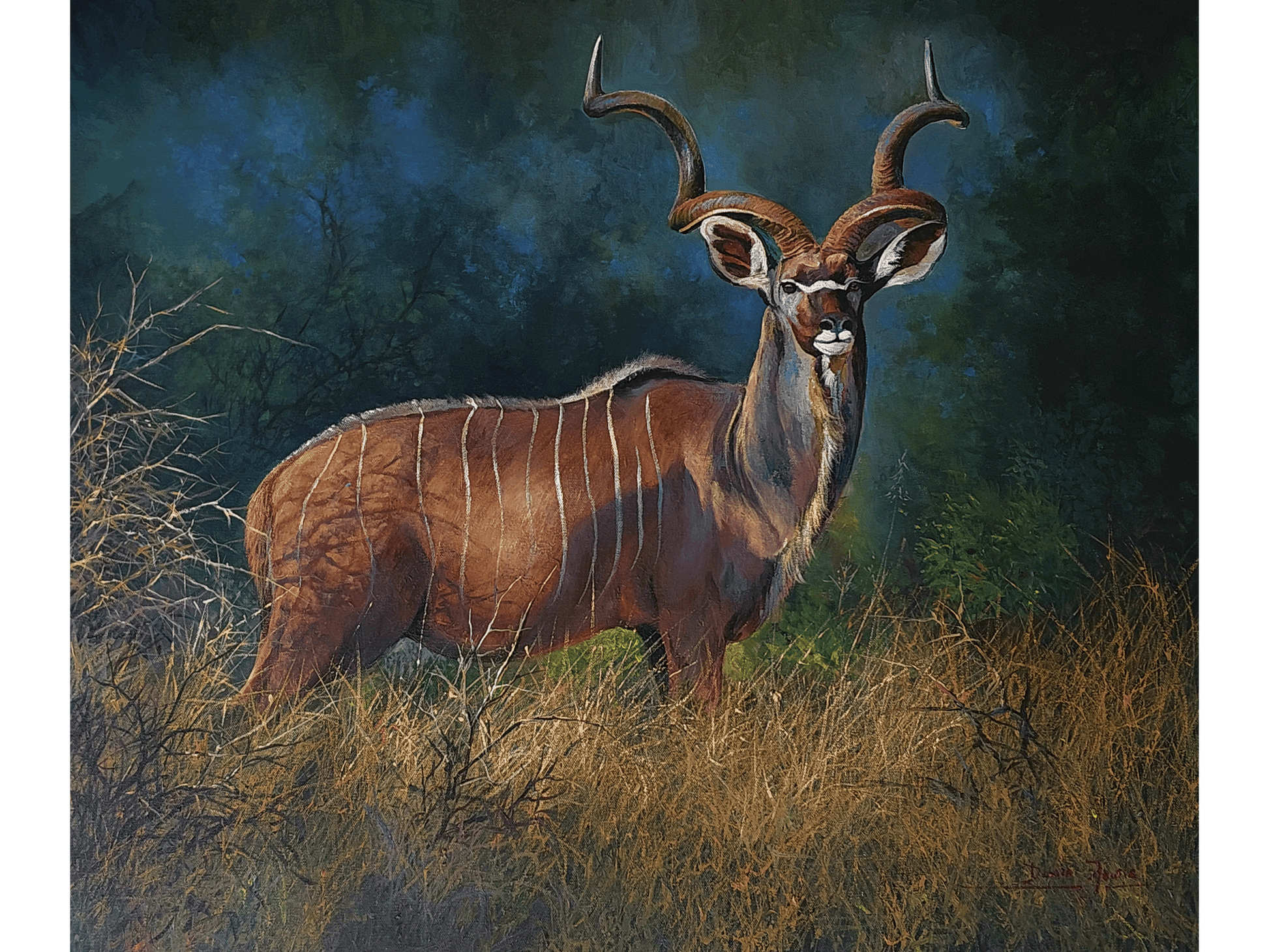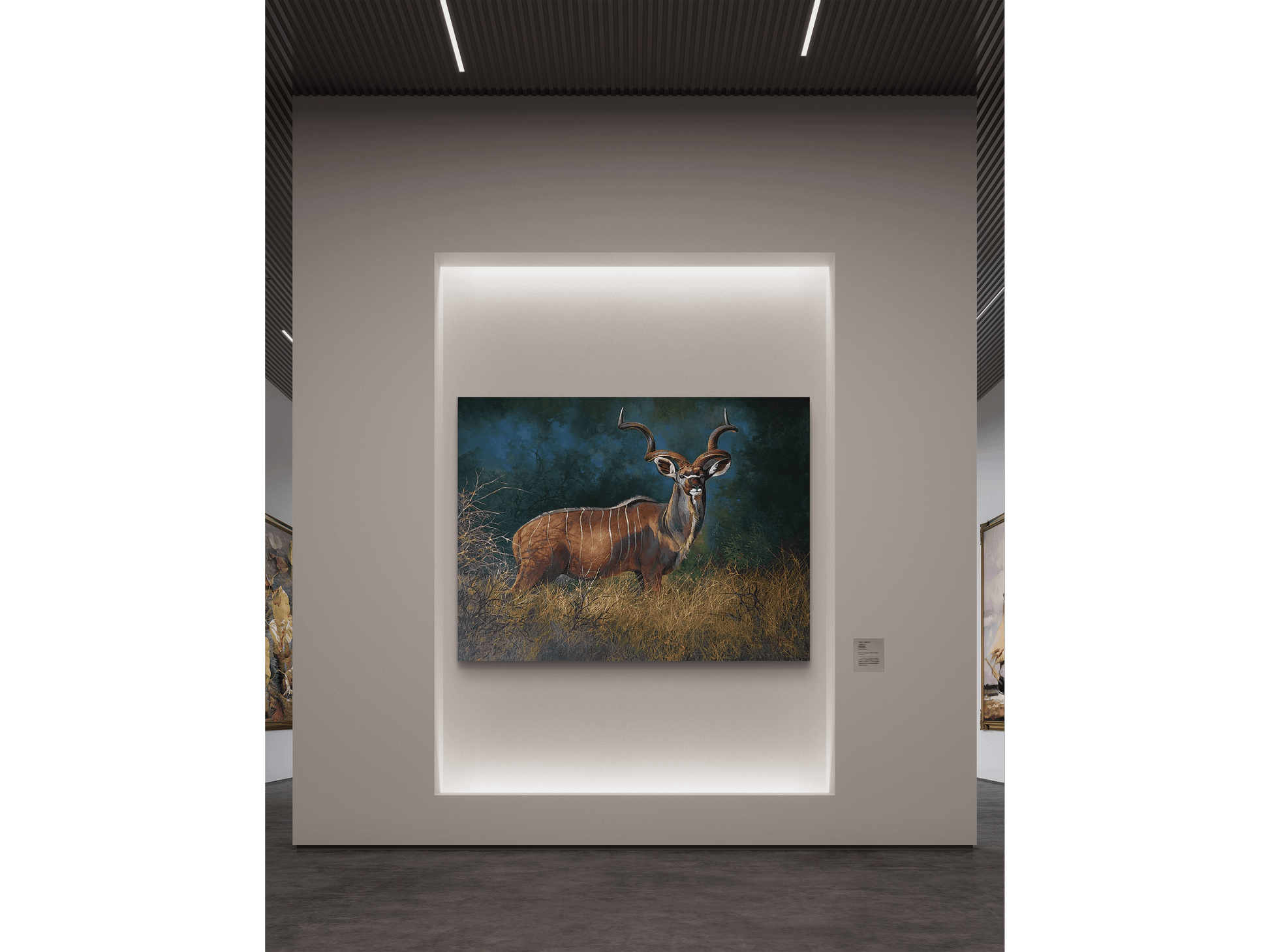 "Kudu Bull" is more than just a portrait; it is a celebration of the raw beauty and quiet dignity of African wildlife. The painting’s dramatic composition and skilful light manipulation ensure it will be a breathtaking focal point in any collection of realistic animal paintings.
