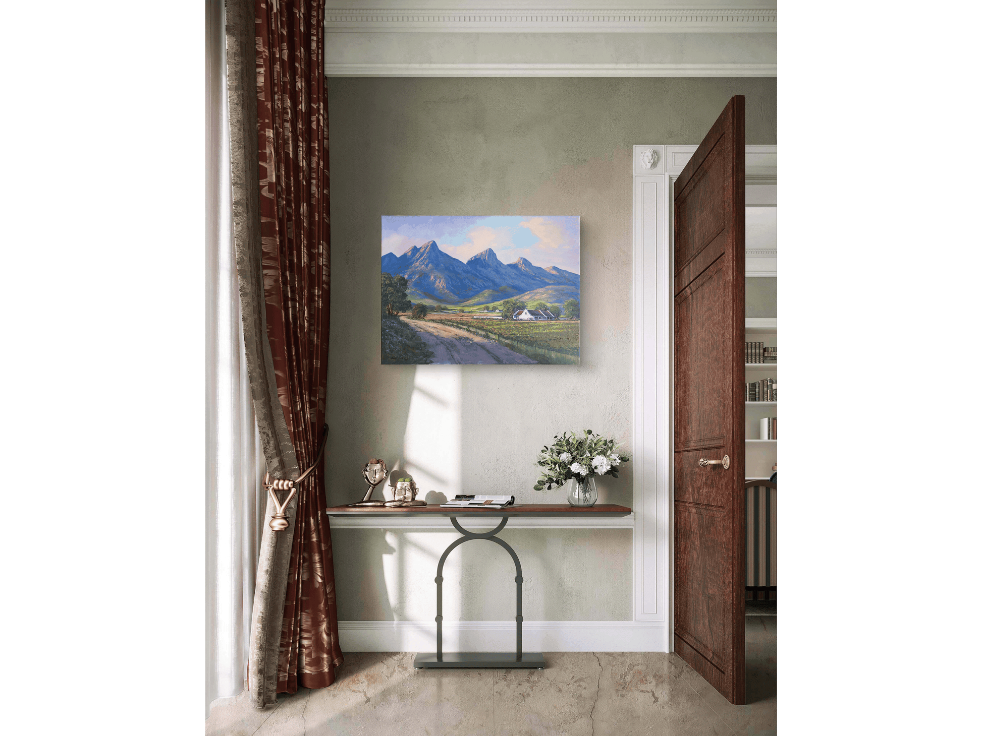 Step into a moment of pure, sun-drenched tranquillity with "Meirings Ridge," a painting that sings the sweet, gentle beauty of the Cape Winelands. This isn't just a landscape; it's an invitation to breathe in the crisp morning air and feel the peace of a new day unfolding.