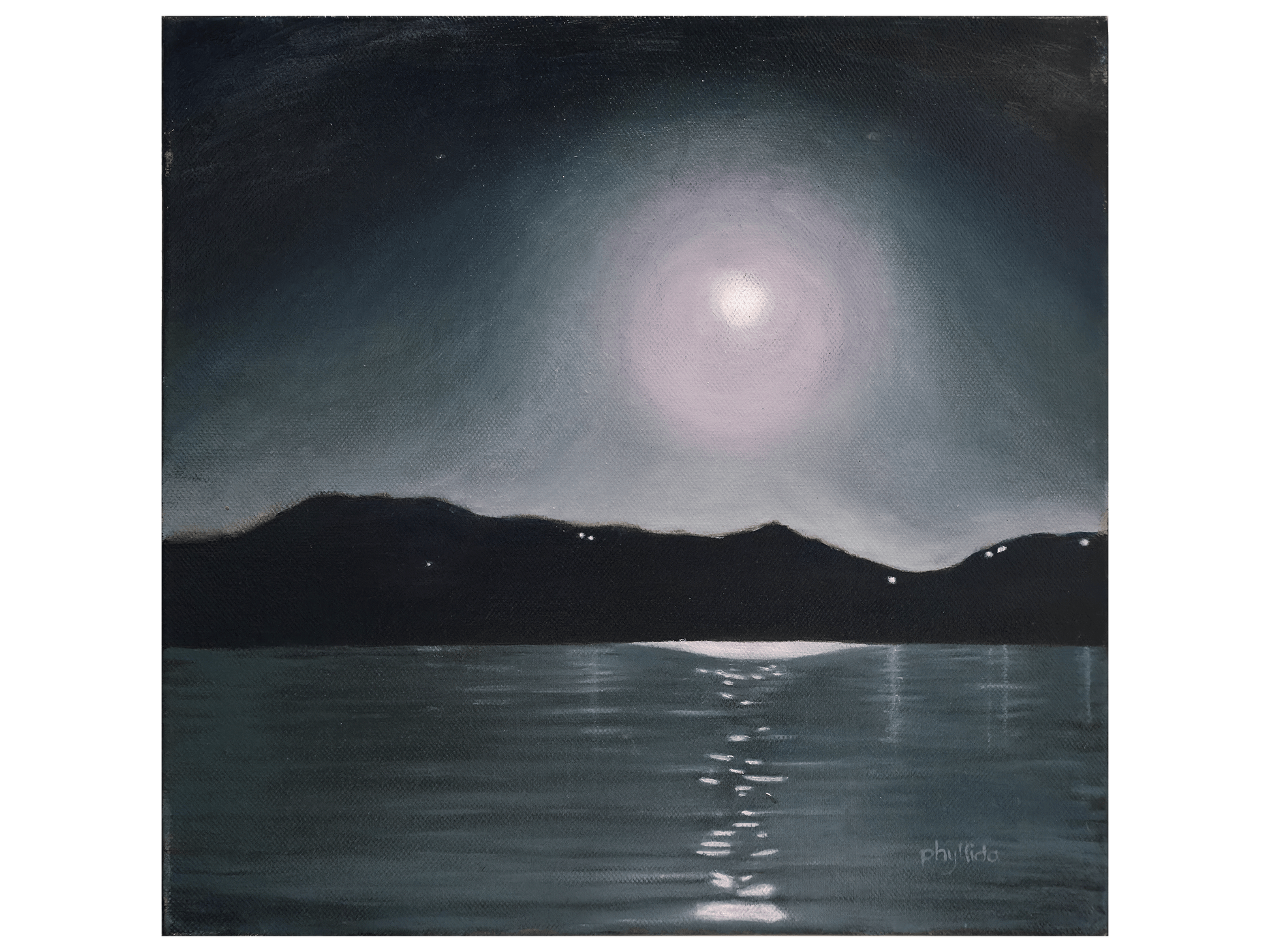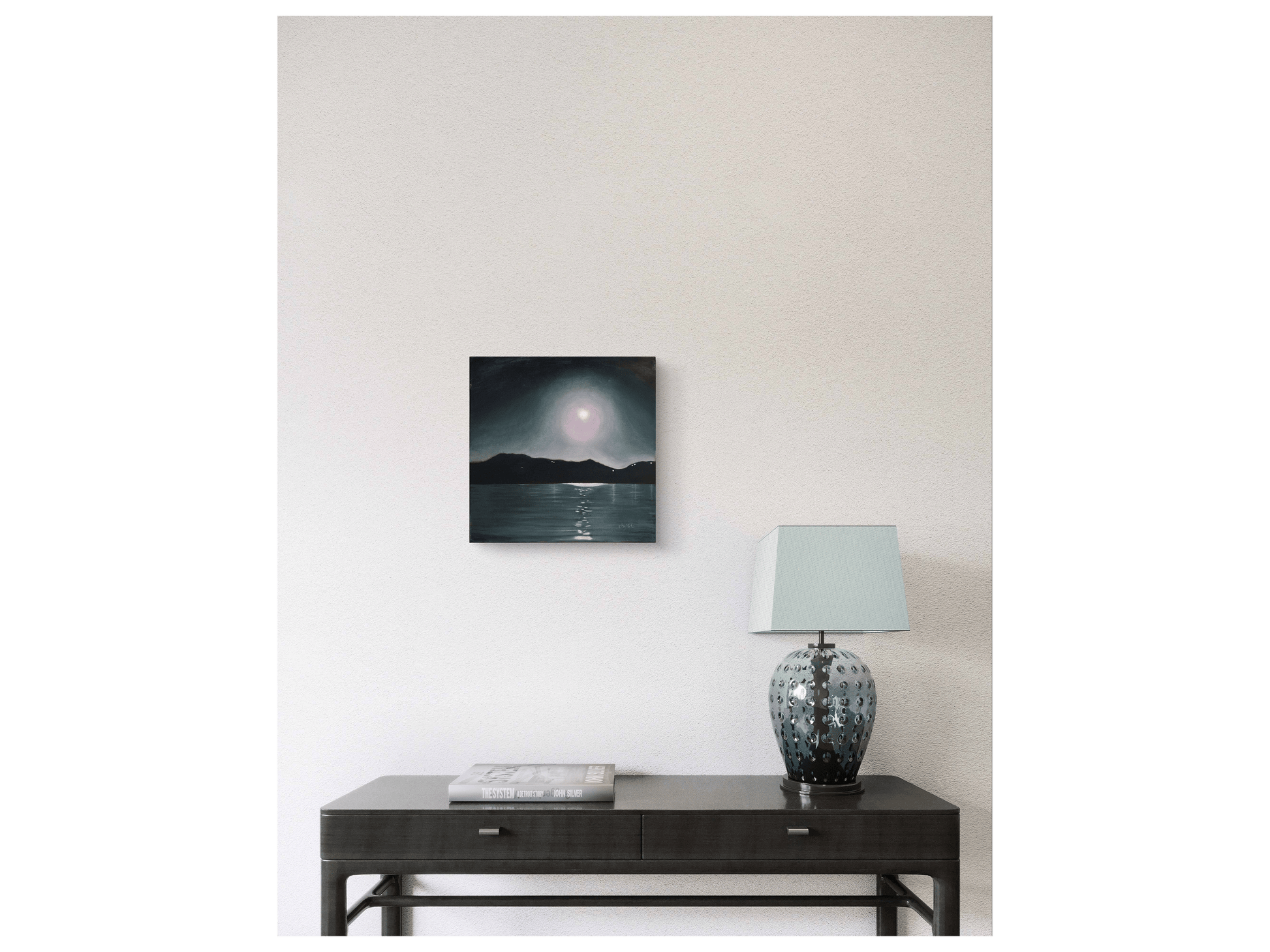 This captivating square piece captures the tranquil mystery of a Greek night, with a brilliant moon dominating the dark sky. The painting focuses on the silhouetted mountains and the shimmering reflection of the moonlight across the calm, inky water. A subtle and meditative artwork, this small canvas offers a collector a quiet, romantic view of the Mediterranean under a full moon.
