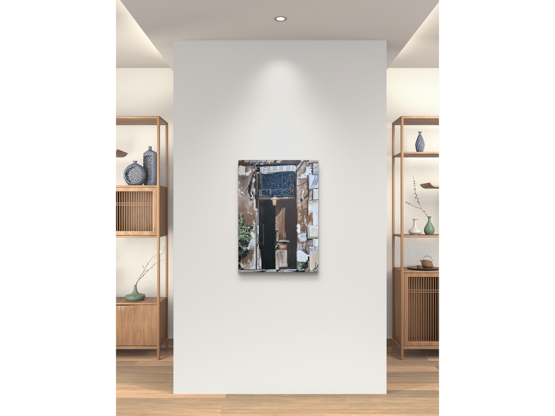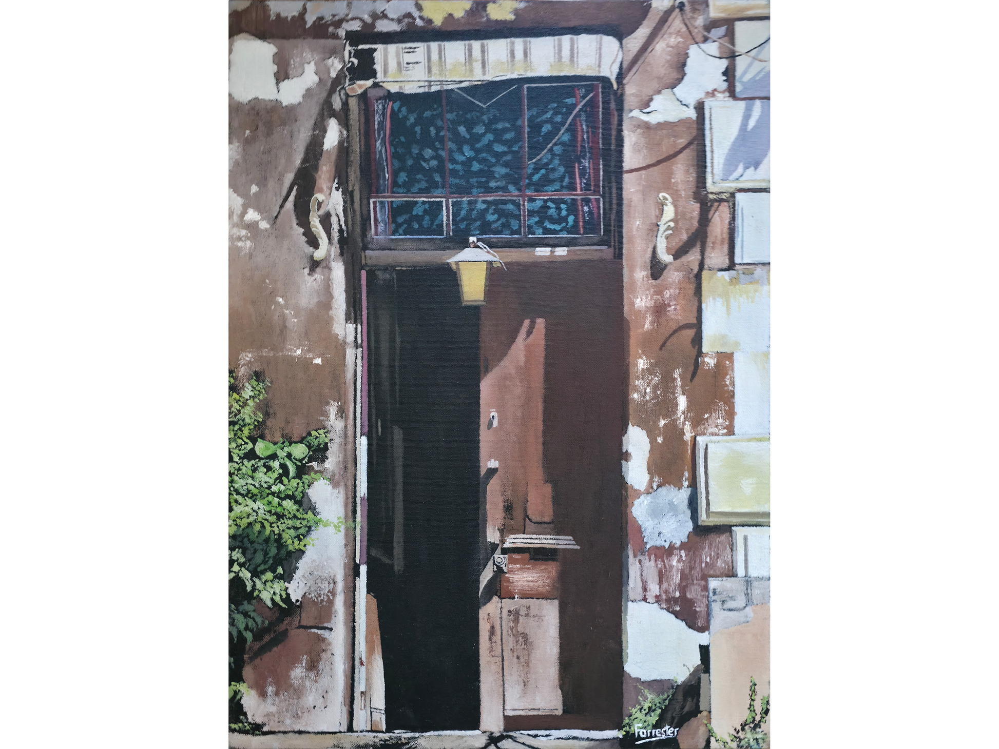 The composition centres on a tall, dark open doorway, set within a facade of distressed plaster and exposed stone. Forrester’s mastery of oil on canvas is showcased through the realistic textures of peeling paint and sun-bleached masonry, rendered in earthy shades of terracotta, ochre, and pale grey. A solitary lantern hangs above the entrance, casting a soft glow that contrasts with the deep, mysterious shadows of the interior. Above the door, a window with an ornate grill reflects the sky or surrounding foliage, adding a layer of architectural detail to the worn structure.