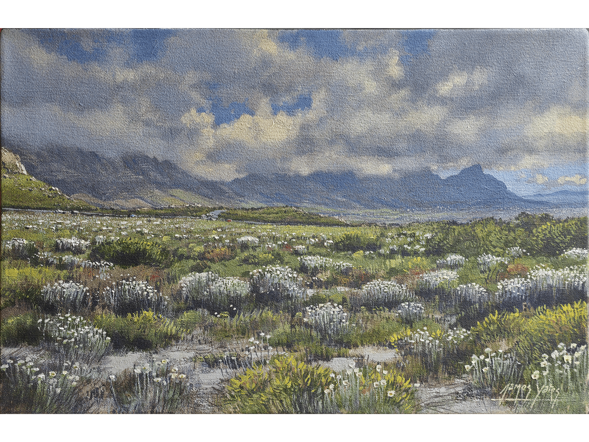 In the mid-distance, the terrain rolls gently before rising to the majestic mountains that form the backbone of the Cape Peninsula. The sky is dramatic, featuring a blend of dark, heavy storm clouds and patches of bright blue, suggesting the rapidly changing weather characteristic of the Western Cape. This masterful depiction of light and weather is a key feature of this James Yates oil painting, which successfully captures the wild, untamed essence of the Silvermine Reserve. This is an exquisite piece of South African landscape art, ideal for collectors of fynbos paintings and admirers of the unique Cape Floral Kingdom.