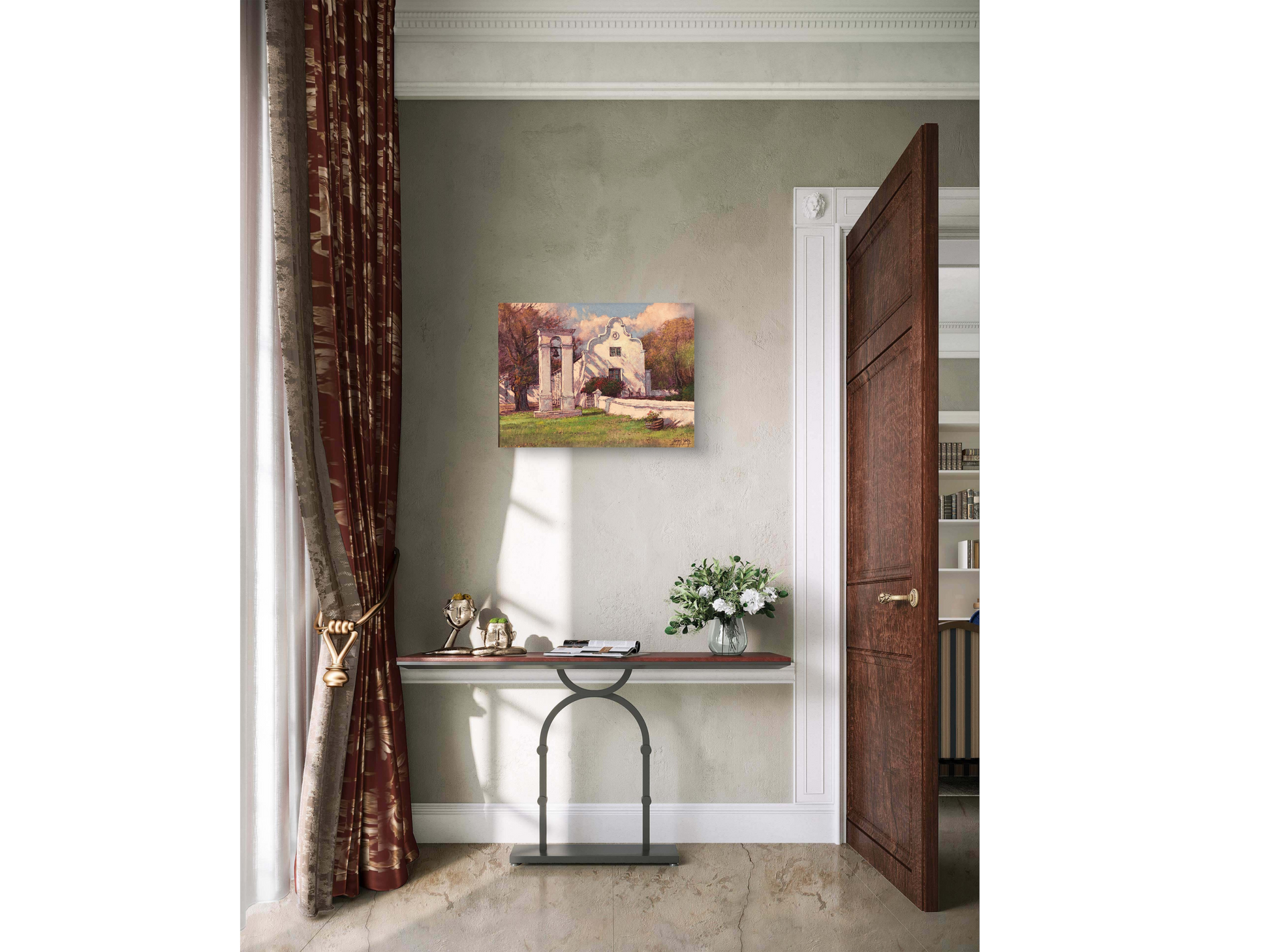 Observe the historic architecture of the Cape Winelands with this intimate original oil painting, titled 'Slave bell at Lanzerac Stellenbosch' by renowned South African artist James Yates. This artwork focuses on the famous bell tower and the main manor house of the historic Lanzerac wine estate.