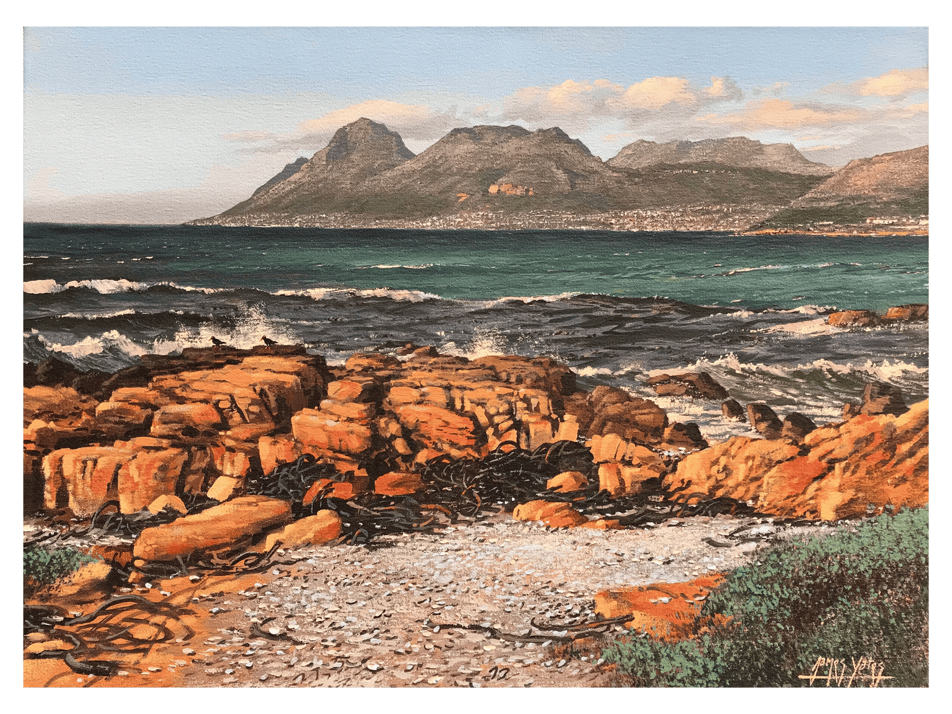 Witness the bracing atmosphere of the Cape coast with this powerful original oil painting, titled 'Smell the ozone, False Bay' by the renowned South African artist James Yates. This artwork captures a rugged, close-up view of the Atlantic meeting the shoreline, with the iconic mountains of the Cape Peninsula defining the distant horizon.