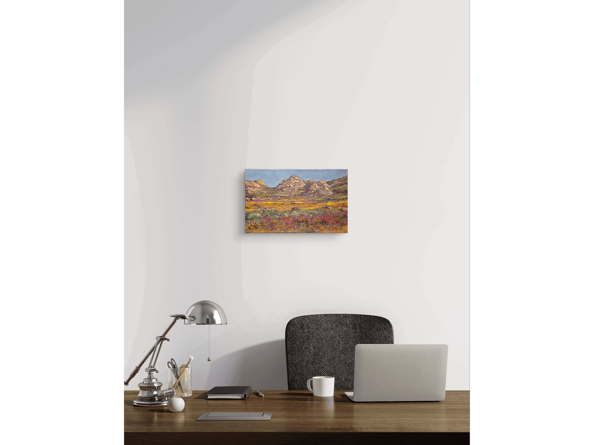 The intimate canvas measures 25 cm (Height) x 40 cm (Width). The composition is a dazzling display of colour and texture, where the foreground explodes with rich impasto strokes of golden yellow, deep magenta, and burnt orange wildflowers. The masterful, textured application of paint conveys the vitality and density of the annual bloom, a key feature of Namaqualand art.
