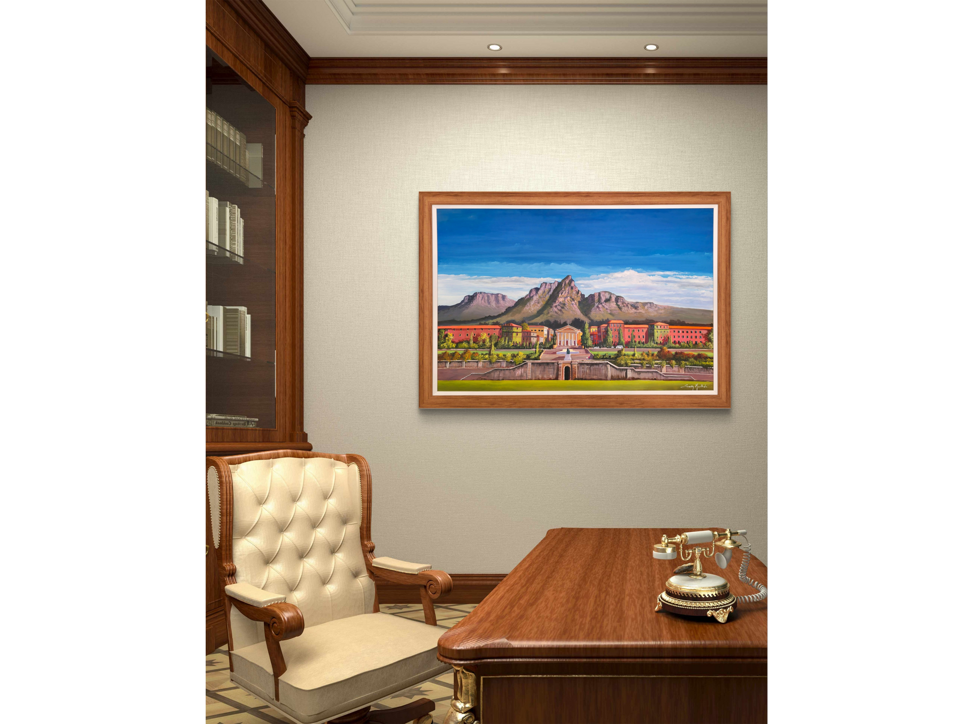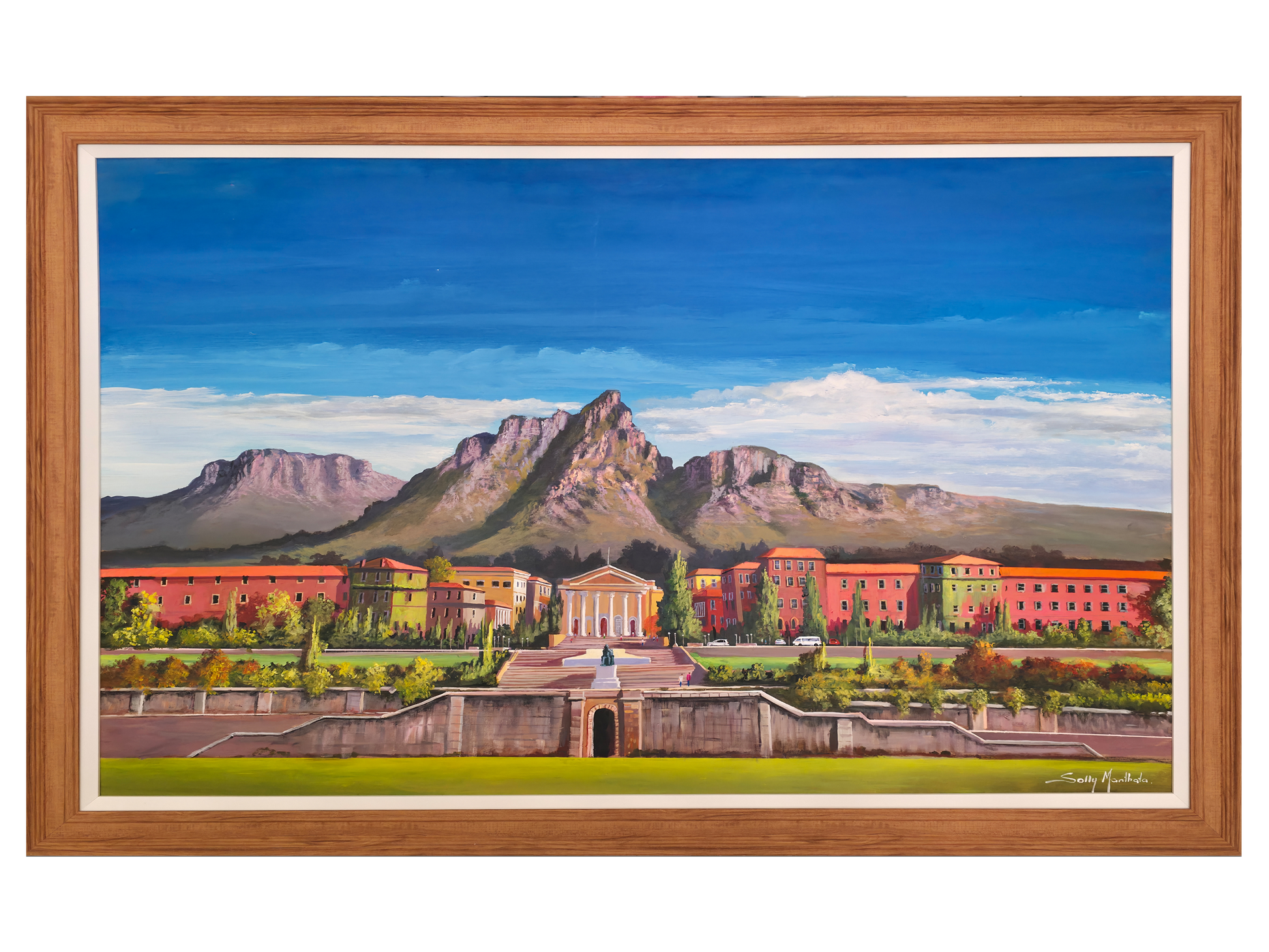 Manthata utilizes his signature style to imbue this familiar landmark with a sense of dynamic, expressive Realism. The painting functions as an enduring commemorative vision of the university, celebrating its place within the majestic Cape Town landscape and appealing to collectors of iconic South African architectural and urban landscapes.