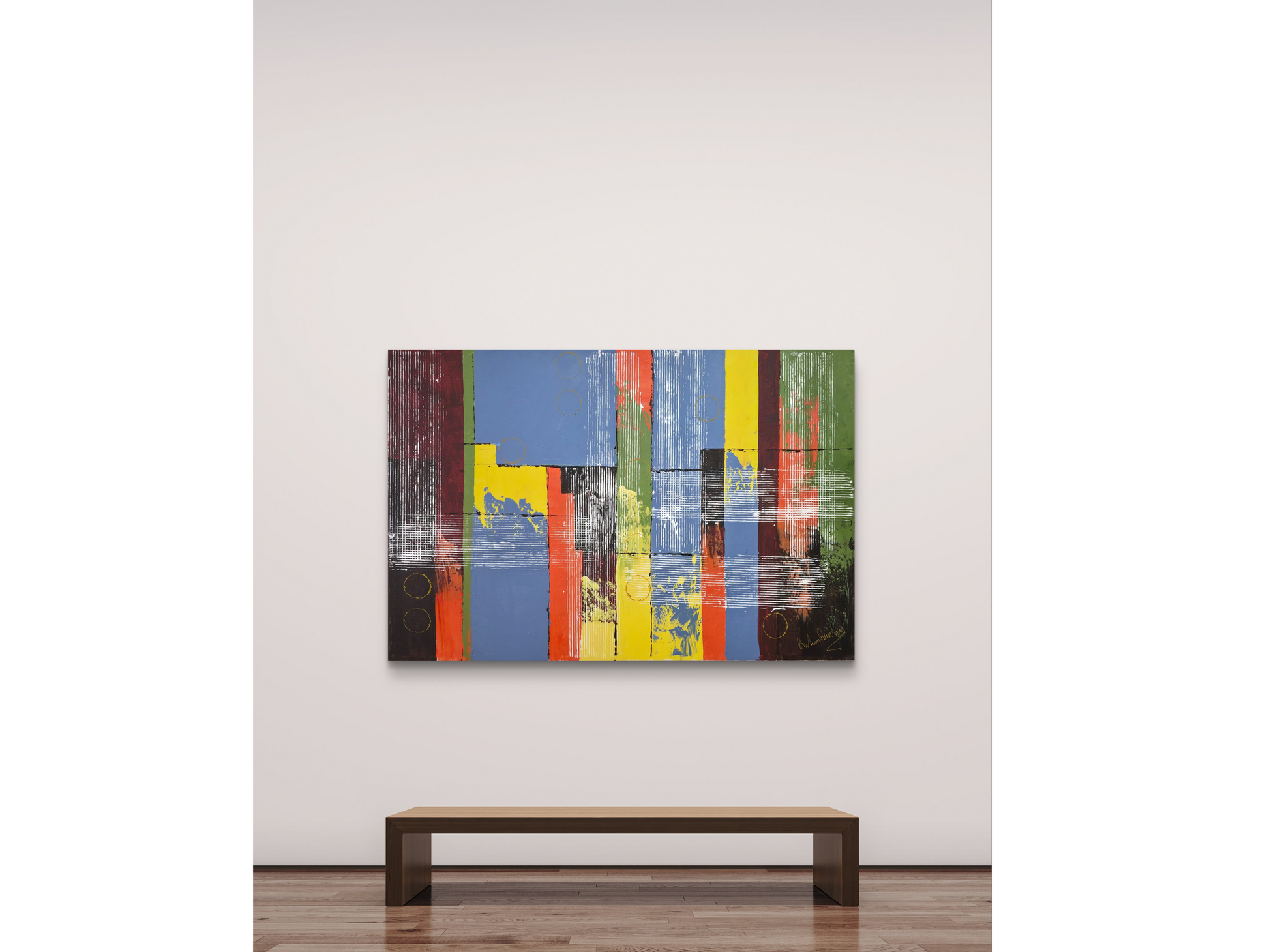 The surface reveals an active process of making. The artist uses sgraffito—scratching through wet or partially dried paint—to create fine white and black linear elements that vertically score the colored bands, providing texture and suggesting movement. Further gestural marks, including apparent palette knife scraping and circles scraped into the paint, function as non-representational motifs that punctuate the composition, breaking the rigidity of the grid and enhancing the sense of spontaneity.