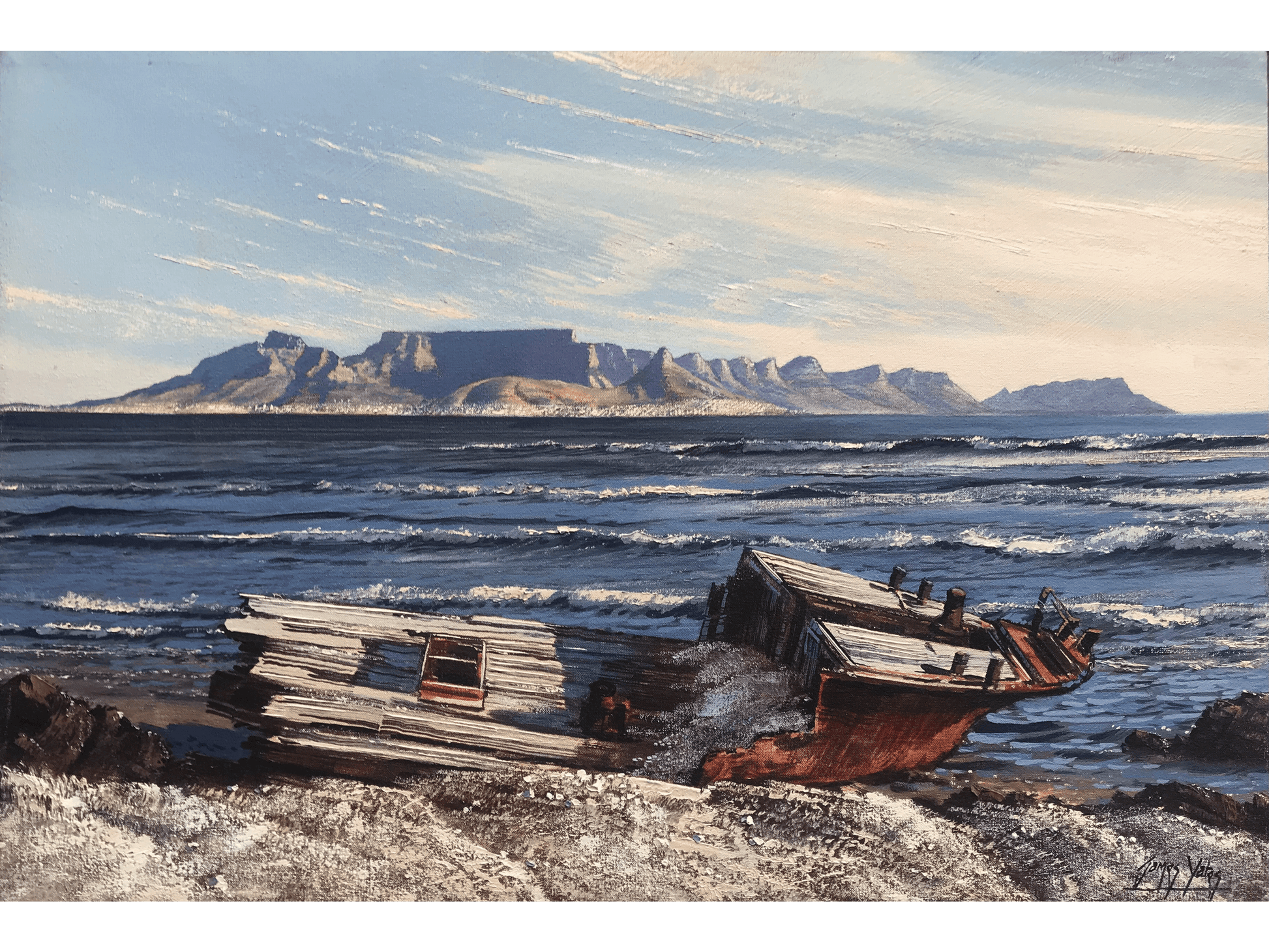The generous canvas measures 51 cm (Height) x 76 cm (Width). The painting is a powerful study in contrast: the beautiful, enduring shape of Table Mountain stands proudly against the clear, blue sky, while the weathered hull of the historic wreck of the Edinburgh rests in the foreground. The rough, deep blue of the Atlantic Ocean connects these two famous landmarks. The warm, golden light hitting the face of the mountain gives the scene an uplifting quality, symbolising hope and resilience.