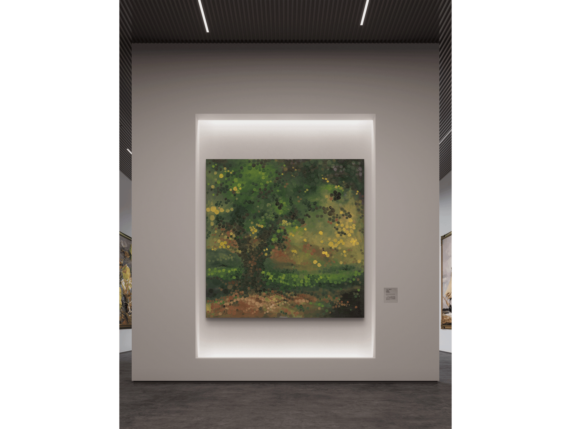 Gazing into a scene of subtle luminescence and deep shadow, 'Whispers of Twilight' is a magnificent original oil painting by the contemporary artist Allison Pilling. This highly evocative, square piece captures the fleeting moment between day and night in a densely wooded space, celebrated through a unique, almost pointillist technique. The generous canvas measures 100 cm (Height) x 100 cm (Width).