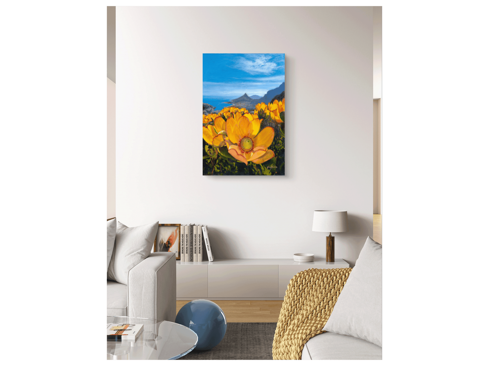 This vibrant, stunning piece features a close-up of bright yellow Leucadendron blooms set against an iconic Cape Town vista. Louw uses a dynamic contrast between the intense yellow-orange flowers and the brilliant blue sky, with Table Mountain and the coastline visible in the distance. A powerful and joyous celebration of Fynbos flora and the magnificent Cape landscape, this artwork bursts with light and energy.